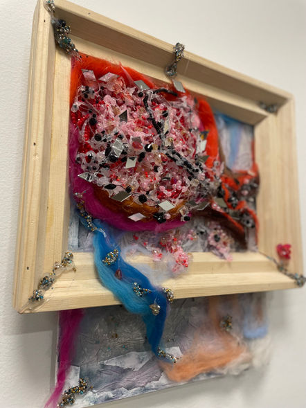 There was no actual paint used in this painting. Instead, I used liquid from mulberry leaves and pomegranate juice. The felting wool is to pay tribute to the importance of rug weaving in Armenian culture. The contrast of soft and sharp textures is a comparable representation of Armenian history- full of massacre and hardship yet so much perseverance and growth. I learned a lot in the process through my research and was actually surprised to see the population of Armenia is actually not much different than pre-genocide, but what is drastically different is the size of land. That is why I chose to represent the pomegranates as land size, beads or “seeds' as people, and the smaller scattered pomegranates as the Diaspora. It was impressive and reassuring to see how much our population has grown despite the loss of land and atrocities.